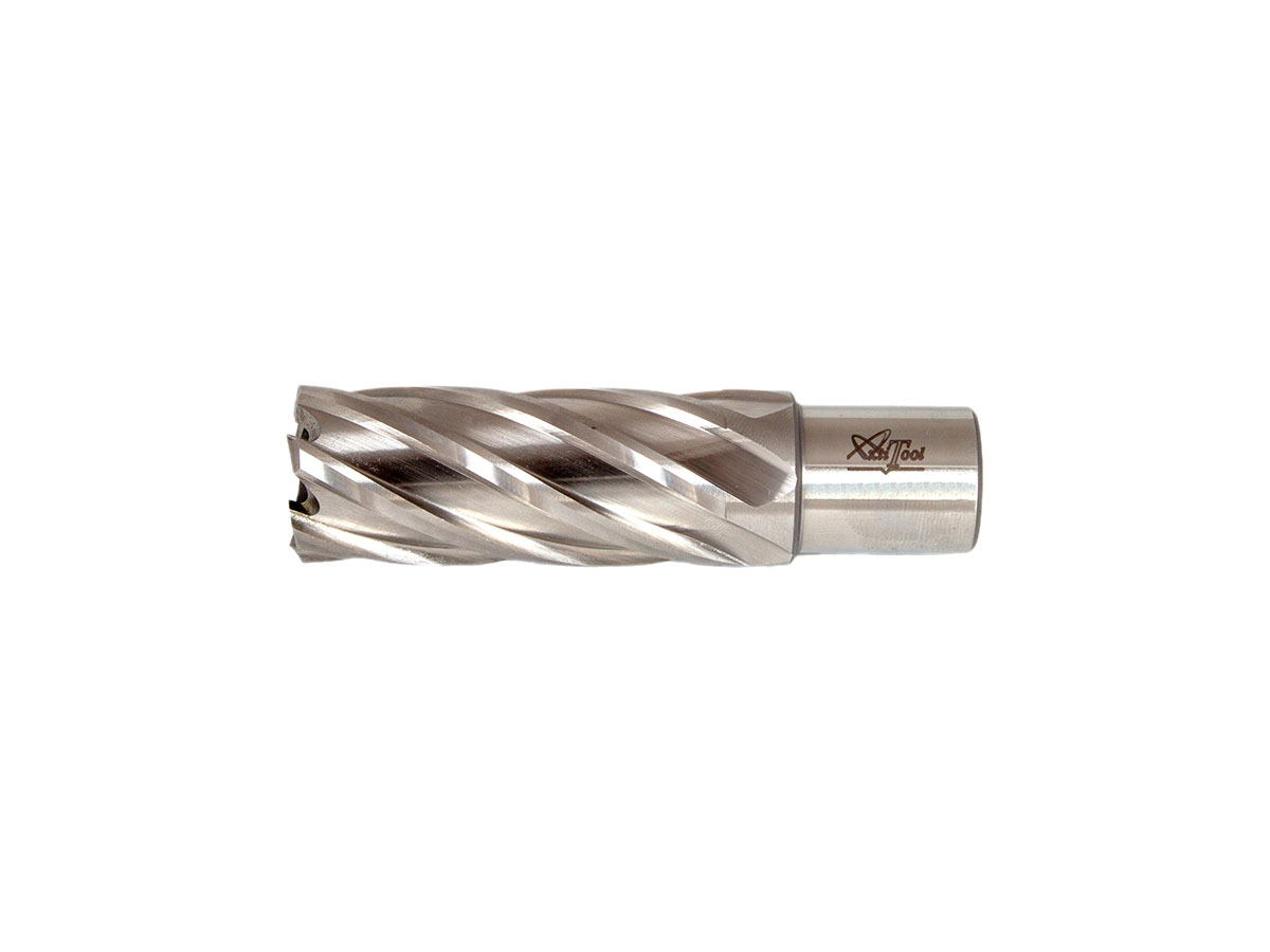 Корончатые сверла AktiTool из быстрорежущей стали HSS изготавливаются из высокопрочной порошковой стали. Высокая производительность, безупречный рез. Прекрасно подойдут для сверления большинства металлов и их сплавов, за исключением сверхпрочных сталей и сплавов. Устанавливаются на магнитные станки с держателем Weldon 19. Для сверления необходимо использовать центрирующий штифт (направляющая) размер 6.34х103 мм. В комплект поставки не входит и приобретается отдельно.Рекомендовано применять СОЖ для охлаждения.